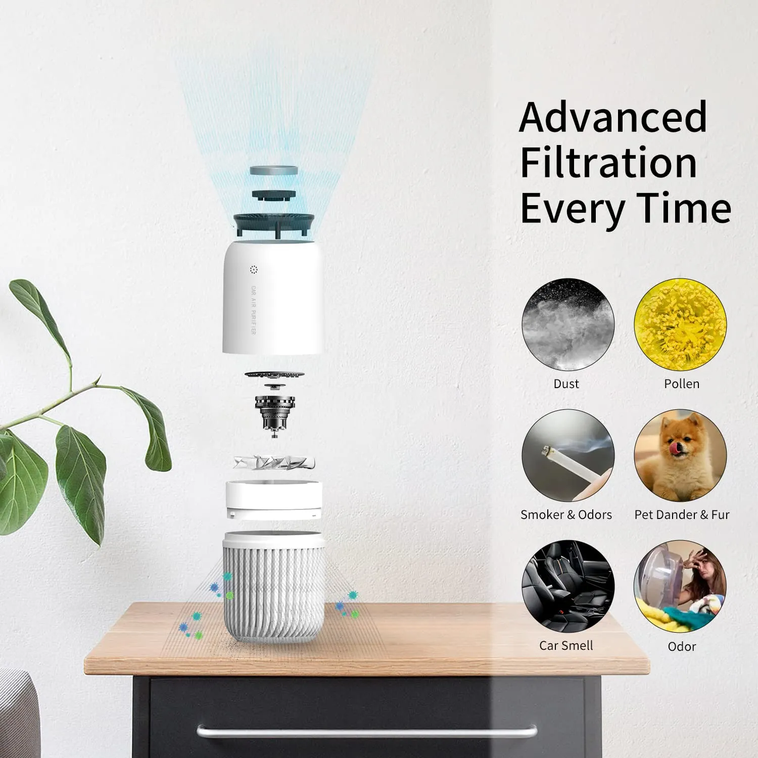- Healthy Air Provider: The mini air purifier comes with Ambient night light display, there are three colors, green for good, yellow for medium, and red for poor. Can quickly purify smoke, pollen, pollutants, dust, odor, and so on.